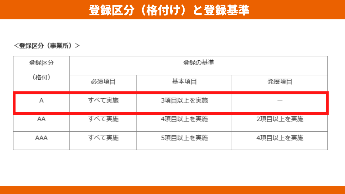 登録区分の格付けでAを取るためには、茨城県のエコ事業所登録制度の取組項目のうち、登録基準の必須項目をすべて実施することと、基本項目で3項目以上を実施してください。