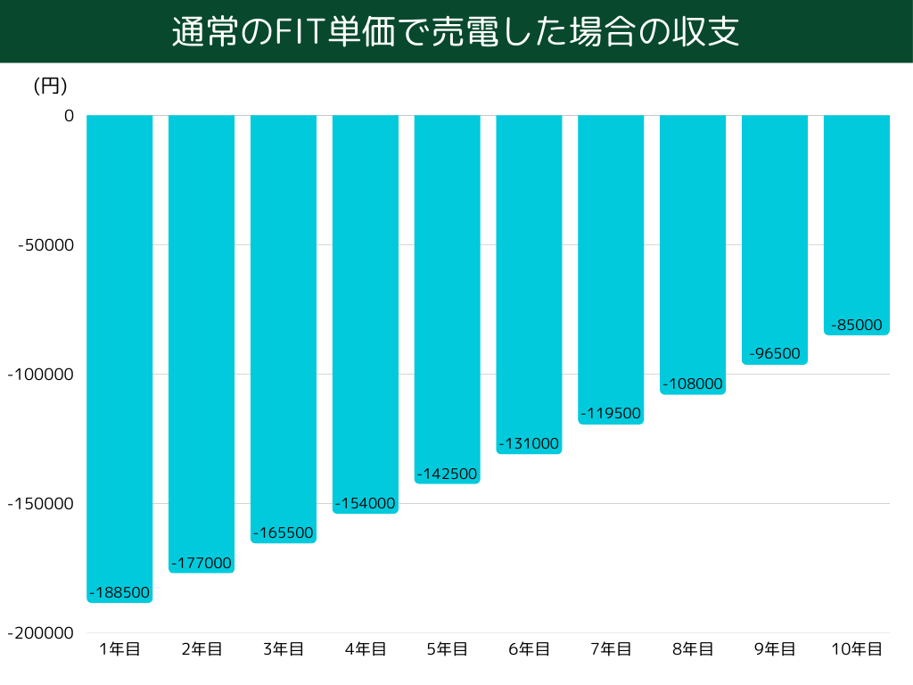 しかし、10年目の収支を見ると30,000円となっており、これは自家消費の50,000円よりも少ない金額です。