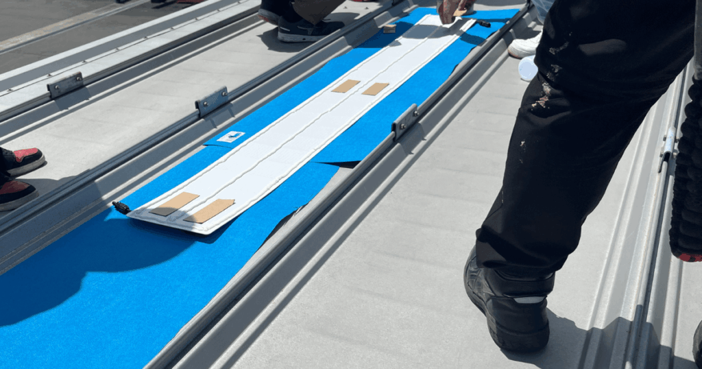 接着剤と接着テープのついたパネルの設置です。最後に、ローラーを使って完全に接着させます。接着期間は、20年から30年です。