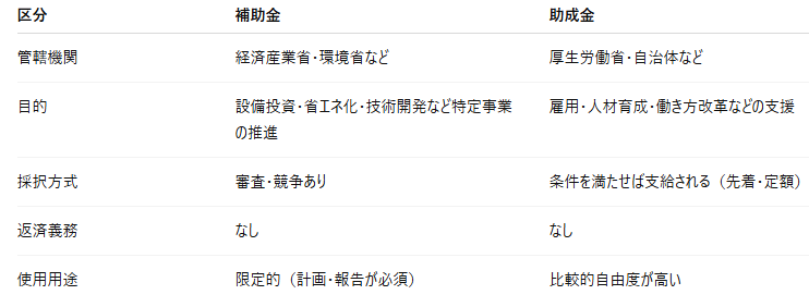 補助金と助成金は、いずれも企業の事業活動を支援する制度ですが、目的と運用方法が異なります。