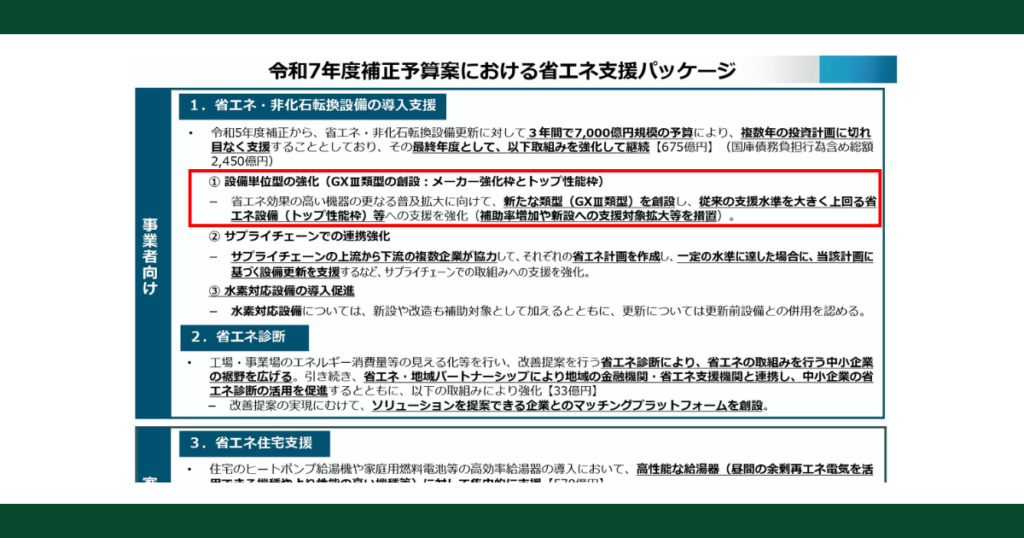 省エネ設備の新設で補助金を使う場合は、GXⅢ類型(GX設備単位型)のトップ性能枠に限られますので、お気をつけください。