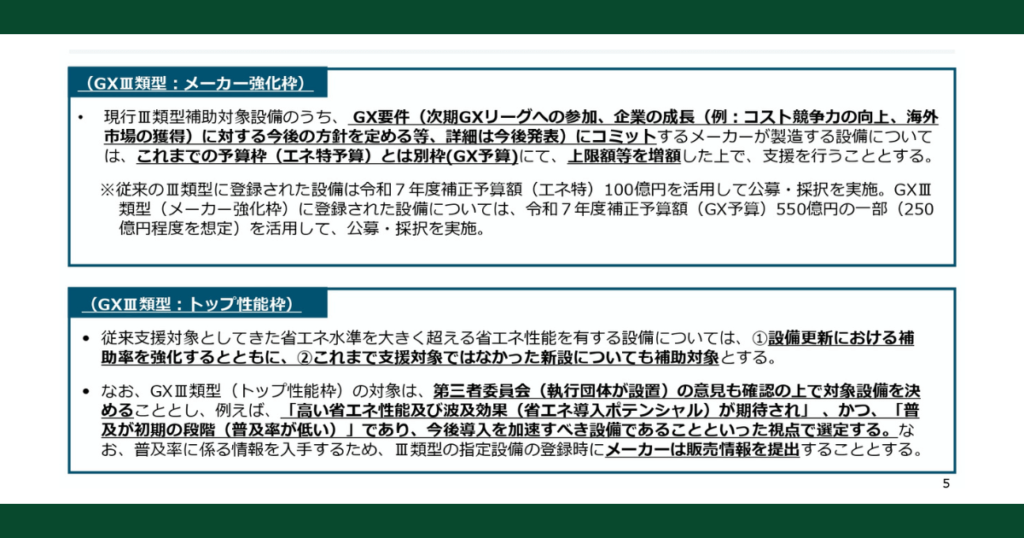 また令和8年から、新設設備向けのGXⅢ類型「トップ性能枠」が追加される見込みです。